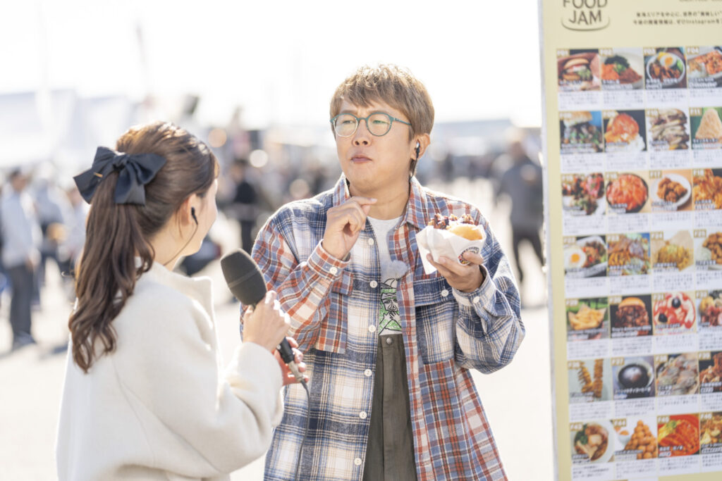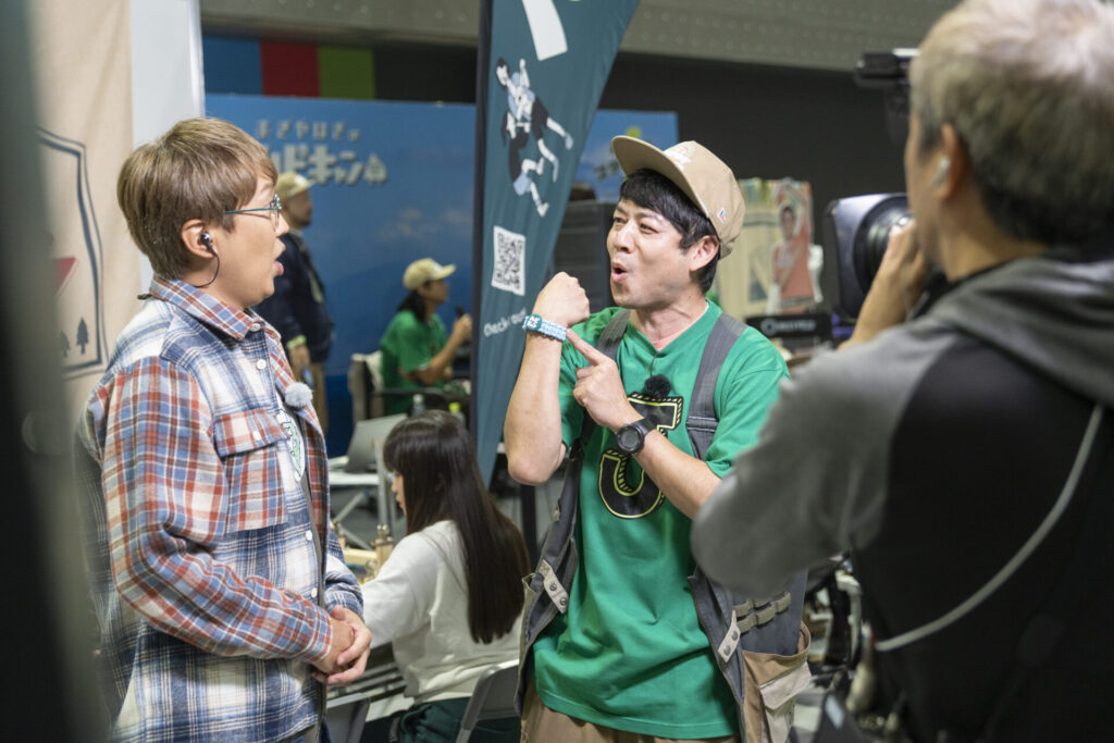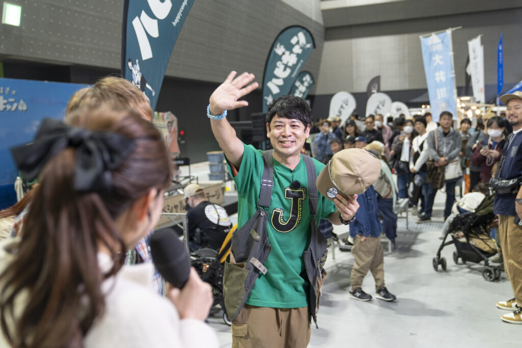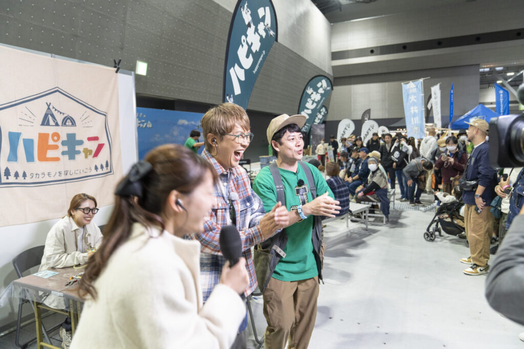 この時、実はステージではゲストのトークステージが開催中。MCとして登壇している中、ステージから降りてきてくれたばもんさん。ハピキャンステーションの紹介が終わると、ステージへ戻っていきました。