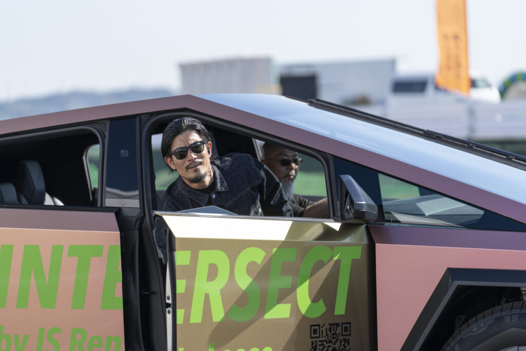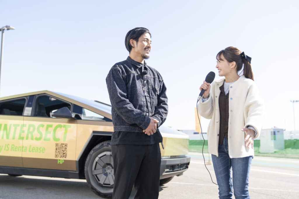 屋外エリアを歩いていると、尾形アナの視線の先にいたのは、なんとテスラのサイバートラックに試乗する祖父江大輔さん!