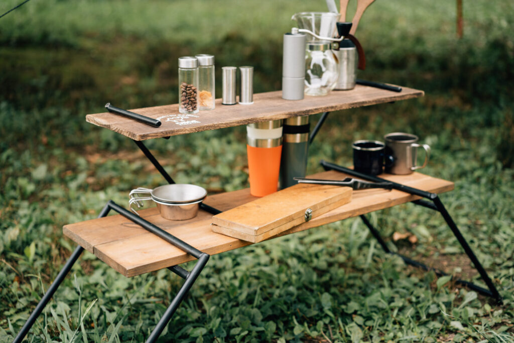 さらに、別のアイアンラック(例:ONOEのアイアンレッグなど)と組み合わせることで、2段目やL字型の複雑な棚を作ることも可能。キャンプのスタイルや庭のスペースに合わせて、無限にカスタマイズできます。