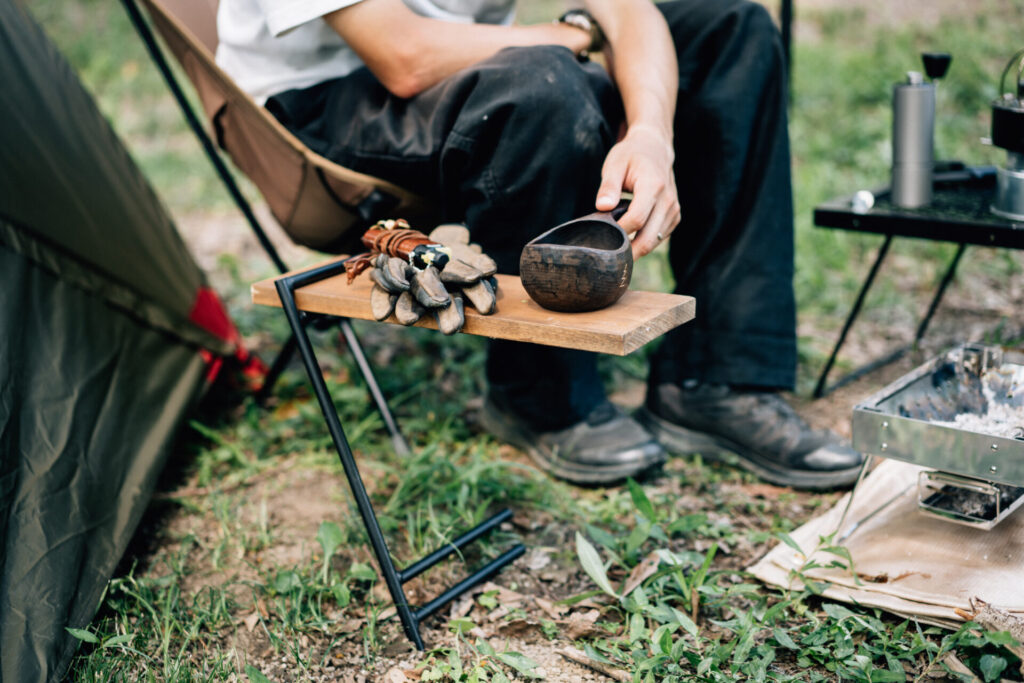 アイアンストライクは、1本単体でも使用可能!地面に斜めに差し込み、上段に木の板を挟むだけでミニテーブルが完成します。