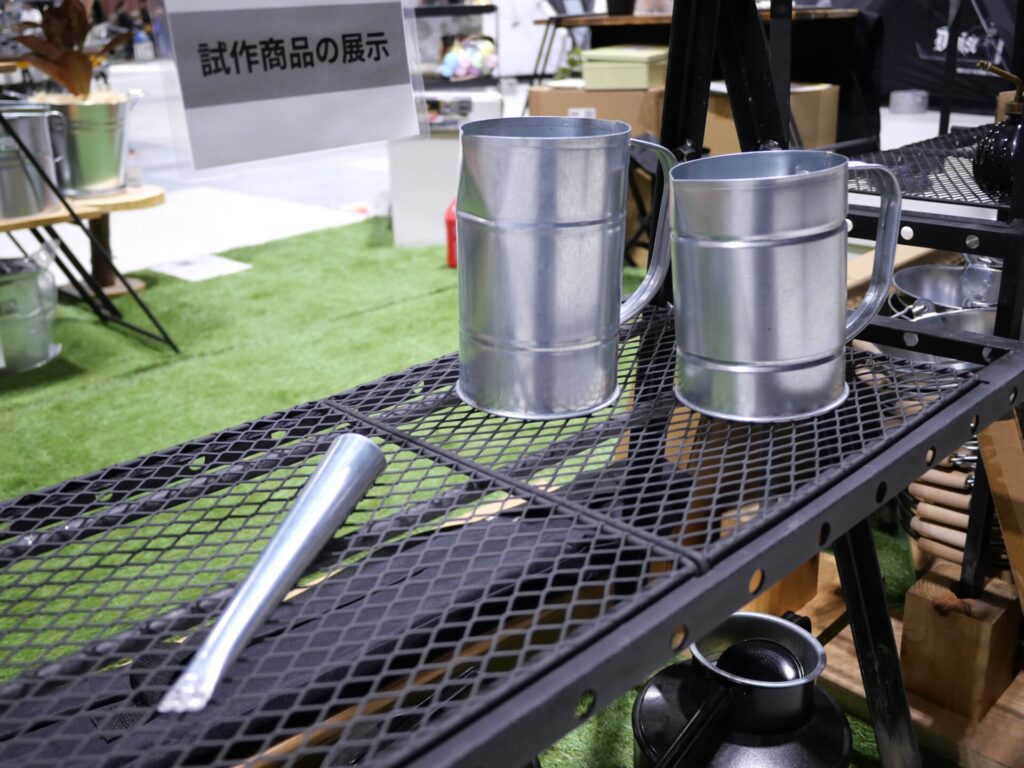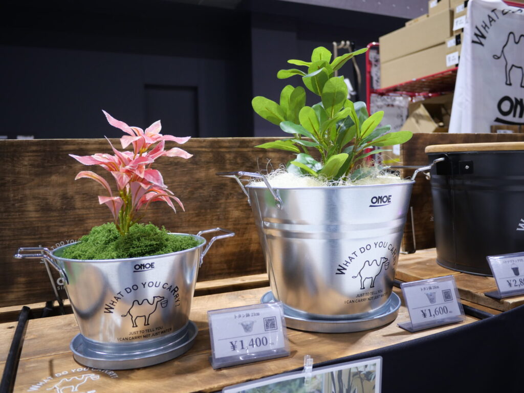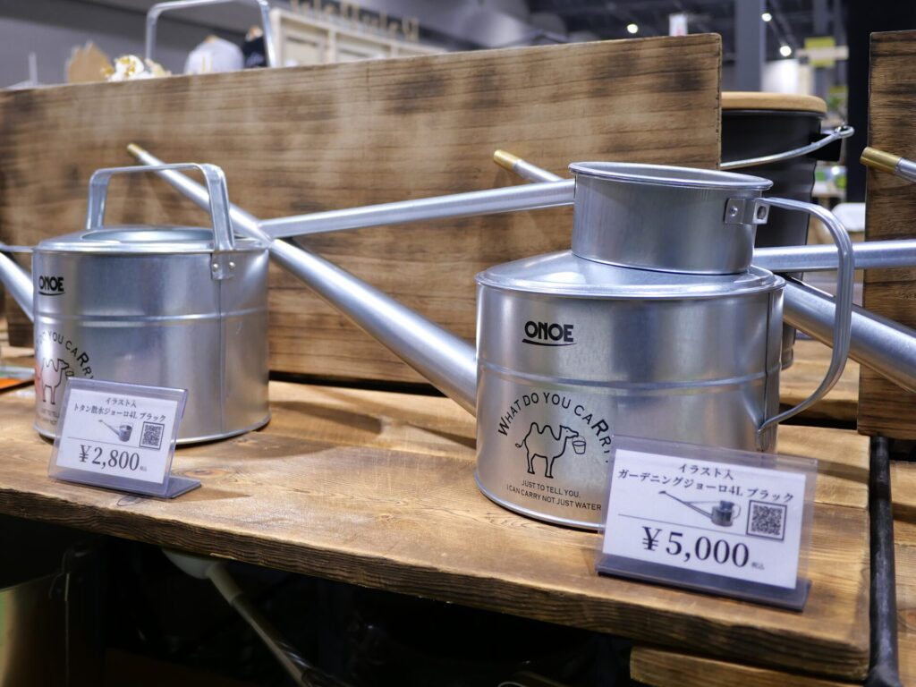 ウッドラックと芝生を基調とした、ガーデンのようなナチュラルな雰囲気のブース。そこで目を引いたのは、トタン製の鉢やジョーロ、チリトリといったガーデンアイテム。