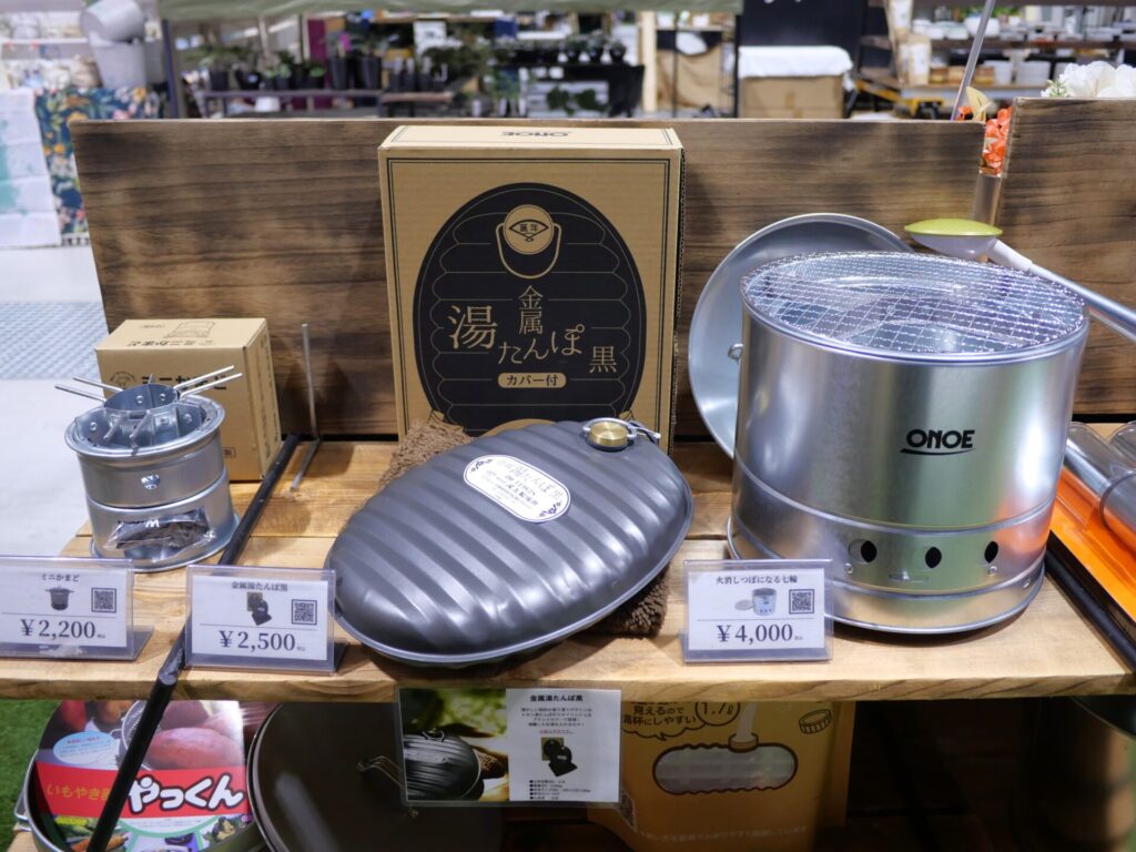 もちろん、「火消しつぼになる七輪」や「ミニかまど」といった定番の火器ギア、さらには耐久性抜群の「金属湯たんぽ」も並び、ONOEらしさも健在です。