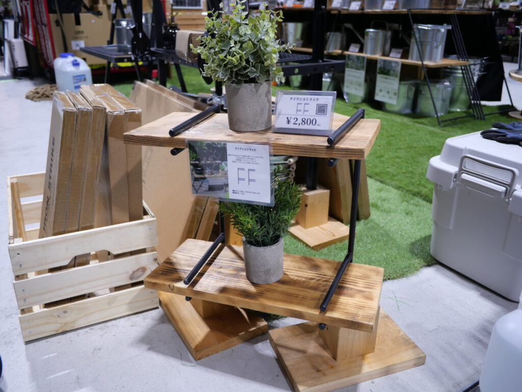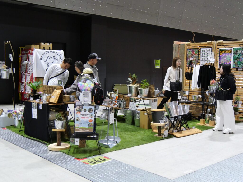 レトロな風合いのトタンが植物の鮮やかさと調和し、キャンプ用品メーカーのブースというより、雑貨店のような空気感をまとっています。
