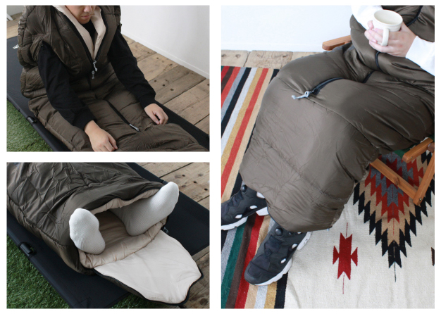 専用のファスナーを開ければ、手足だけを外に出すことができるため、上半身を暖かく保ったままスマホ操作や読書も可能。「足元だけ暑い」と感じたときに、足先を出して温度調整できるのも嬉しいポイントです。冷えやすい首元や頭まわりには、特許取得の独自構造「ドラフトフード」を採用。立体的に立ち上がる構造が、冷気の侵入をしっかりとブロックしてくれます。