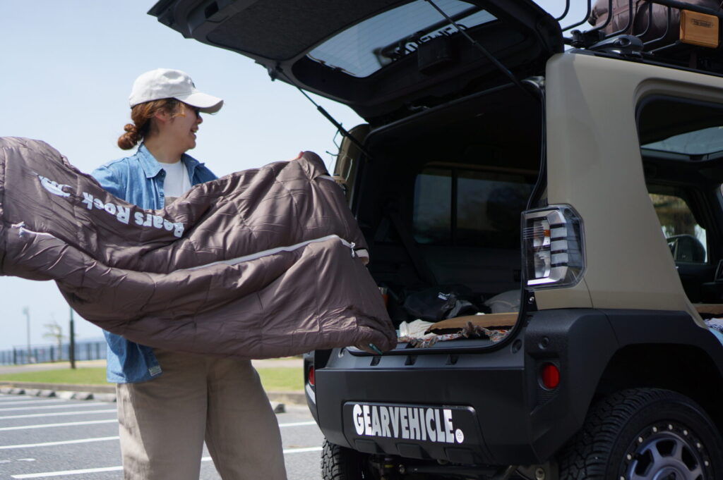 実用面でも、キャンパーに嬉しい工夫が詰まっています。中綿には空気をたっぷり含む化学繊維を採用しており、ふっくらとした寝心地を実現。さらに、汚れた場合でも洗濯機で丸洗いできる手軽さも魅力です。撤収時には、付属の「しろくまん圧縮袋」を使えば、ベルトを締めるだけで簡単にコンパクトサイズにまとめられます。