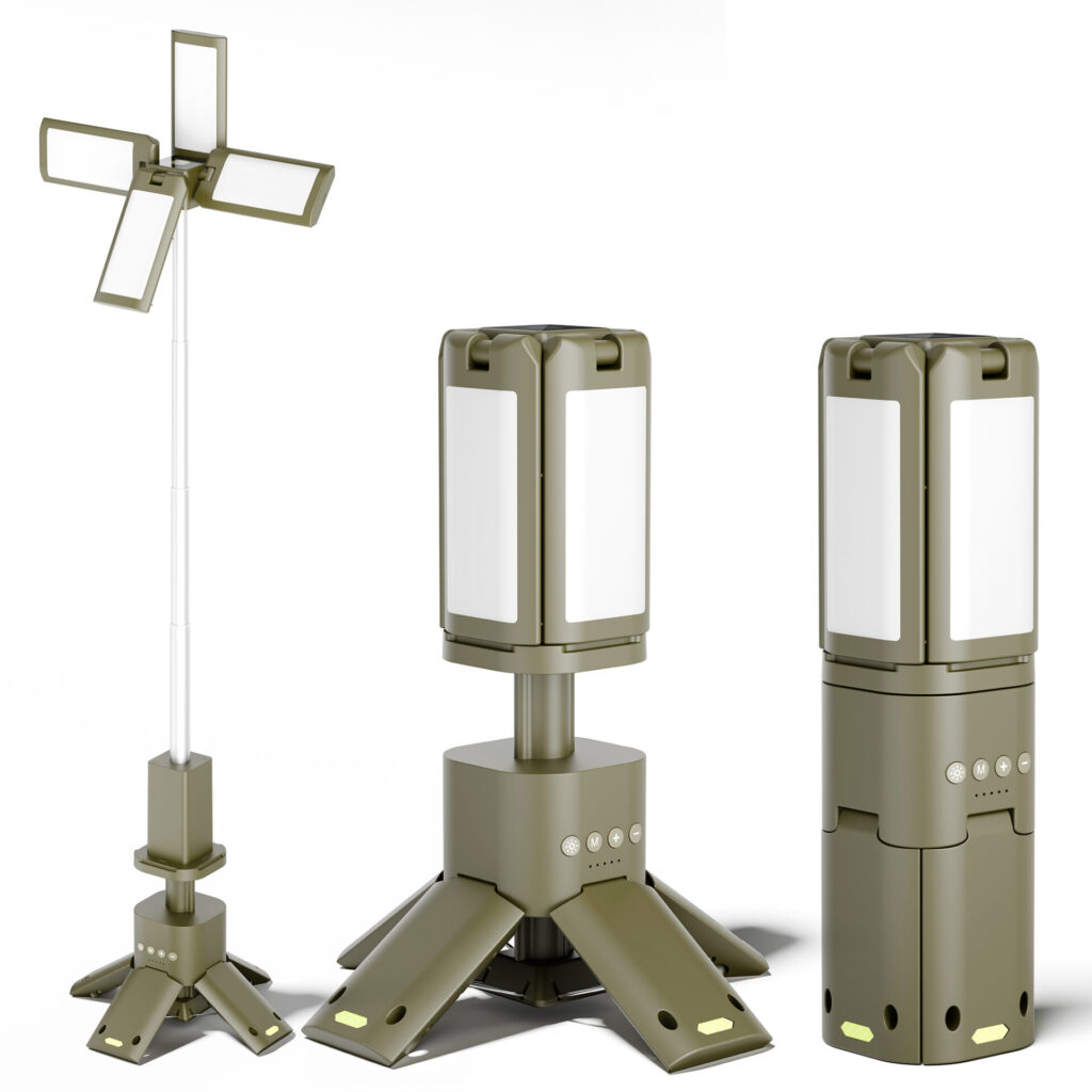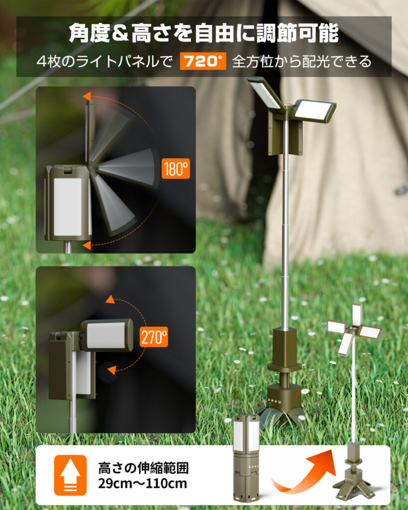 本体を上に伸ばせば、最大111cmの高さを持つスタンドライトへと早変わり。わざわざ重いランタンスタンドを持ち運ぶ必要がなく、これ1台で高い位置から周囲を明るく照らせます。逆に小さく折りたためば、テーブルの上やテント内の天井にもフィット。4枚の独立したLEDパネルはそれぞれ角度調整が可能なため、手元を集中して照らしたり、空間全体をふんわり包み込んだりと、必要な場所に光を届けられます。