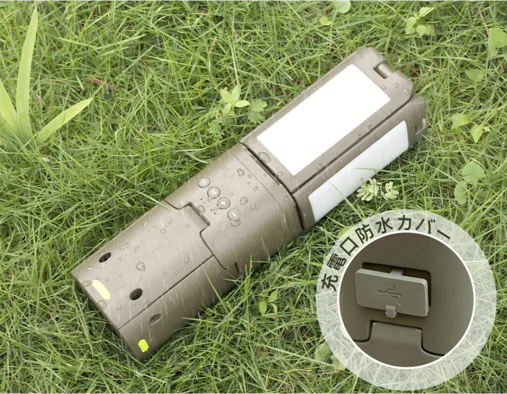 中身は非常にタフ。14000mAhの大容量バッテリーを搭載し、一度の充電で最大80時間の点灯が可能です。スマートフォンの充電ができるモバイルバッテリー機能や、急な雨にも対応できる防水性能も備えています。