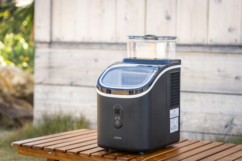 キャンパー向け家電部門の一つ目は「ALTENA クリアキューブ 高速製氷機」。小型でアウトドアにも持ち出しできる製氷機です。キャンプではクーラーボックスと保冷剤をどれだけ駆使しても氷を作るのは至難の業。最近はポータブル冷蔵庫の登場で冷蔵・冷凍ができるようになりましたが、製氷機はまさに次世代的です。