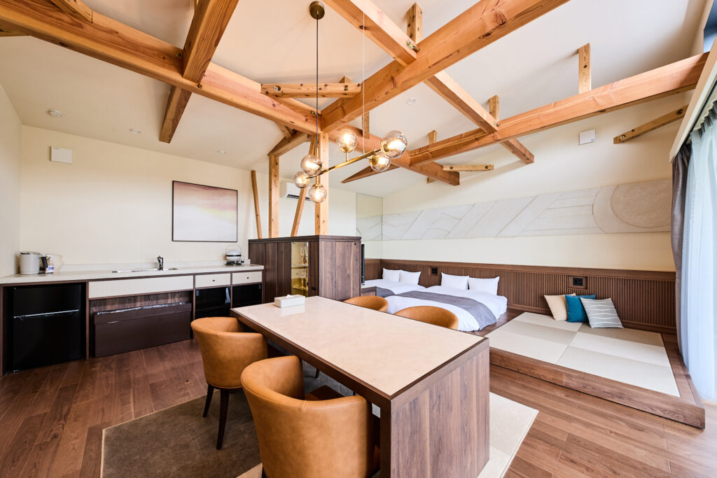 コテージはスタンダードとメゾネットに加え、ワンちゃんと泊まれるペットフレンドリー、1日1室限定のメゾネットスイートの4タイプをラインナップ。それぞれ、おしゃれで快適、そして存分にリラックスできるお部屋になっています。メゾネットスイートには専用サウナとジャグジー、さらにキングサイズのベッドが5台も備えられており、最高の宿泊体験を約束してくれます。