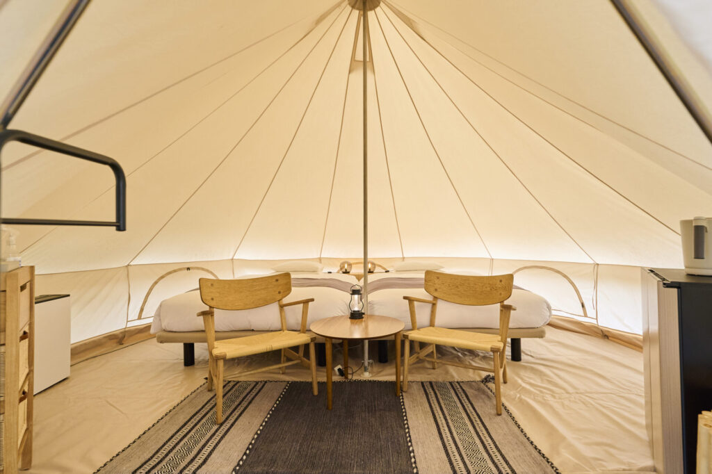宿泊はテントとコテージから選択可能。テントはお馴染みノルディスクのアスガルドやヴァナヘイムを使用しています。テントの中にはベッドが設置されており、快適な空間がゲストを迎えます。テントの周りには森や川があり、思う存分自然を味わえます。