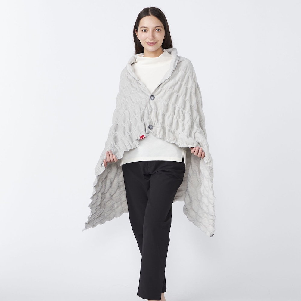 「着れるーの」というユニークな名前の通り、羽織ることを前提に作られた大判アイテム。見た目はまるで掛け布団のようですが、中央に頭を通す穴があり、ポンチョのようにすっぽり被ることができます。
