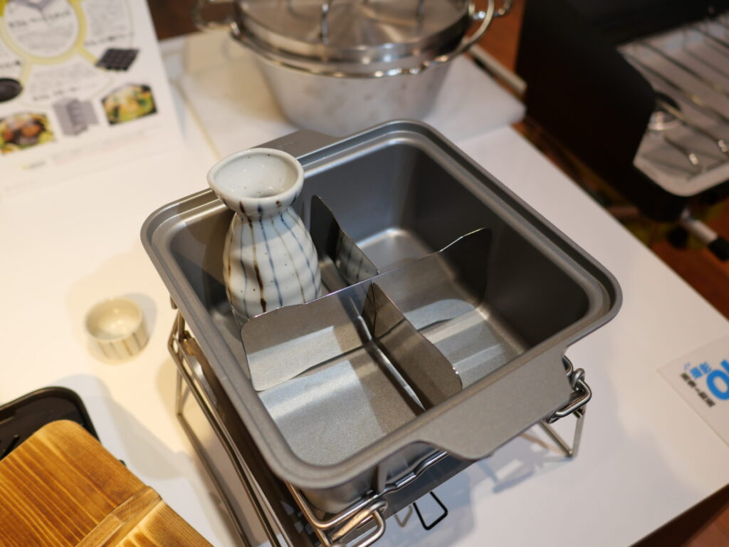 仕切り付き・木蓋付きの本格仕様。満水容量2.9Lで家族全員分のおでんが作れます。揚げ物や鍋、熱燗など冬キャンプの新定番に。