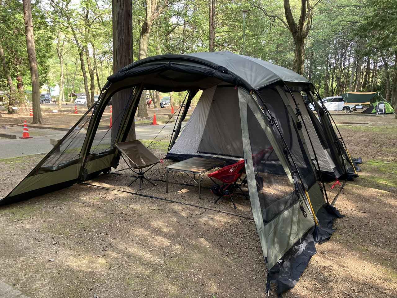 居住空間が広い圧迫感が少ない上、レイアウトの自由度が高く、テント内でテーブルやチェアを好きな場所に配置できます。テントにいながら、自宅にいるように快適に活動できるのが美点です。