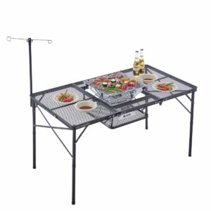 熱いダッチオーブンをそのまま置けるので便利です。メインテーブルは高さを2段階に調節できる上に、中央にグリルや焚き火台を置いて囲炉裏スタイルも楽しめます。
