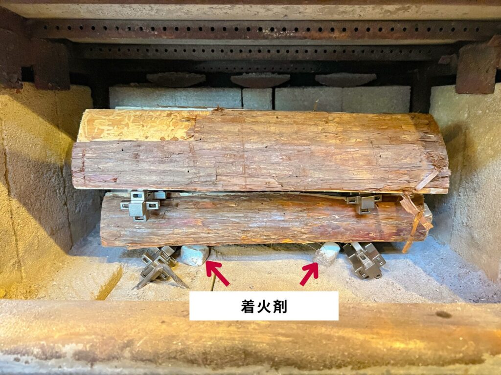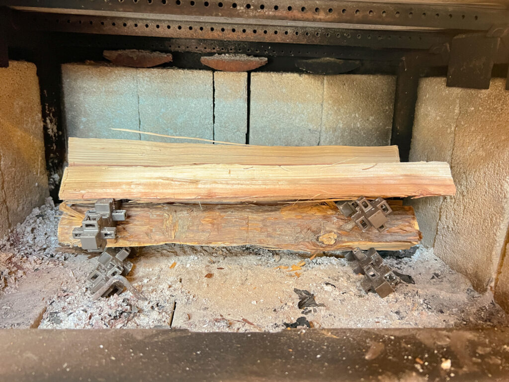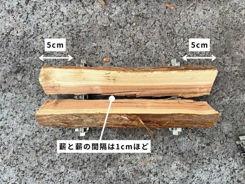 薪の端から内側へ約5cmの位置に「薪一発」を設置し、その上に薪を垂直に2本、並列で置きます。