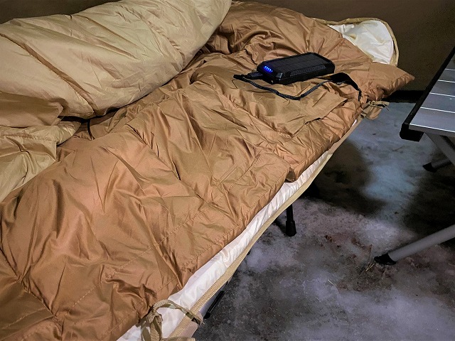 一般的には、ヒーターと中綿の保温力に加えて、断熱マットを併用することで快適性が高まります。車中泊やテント内など風を避けられる環境であれば、過度に高スペックなモデルでなくても十分に暖かく感じやすいでしょう。
