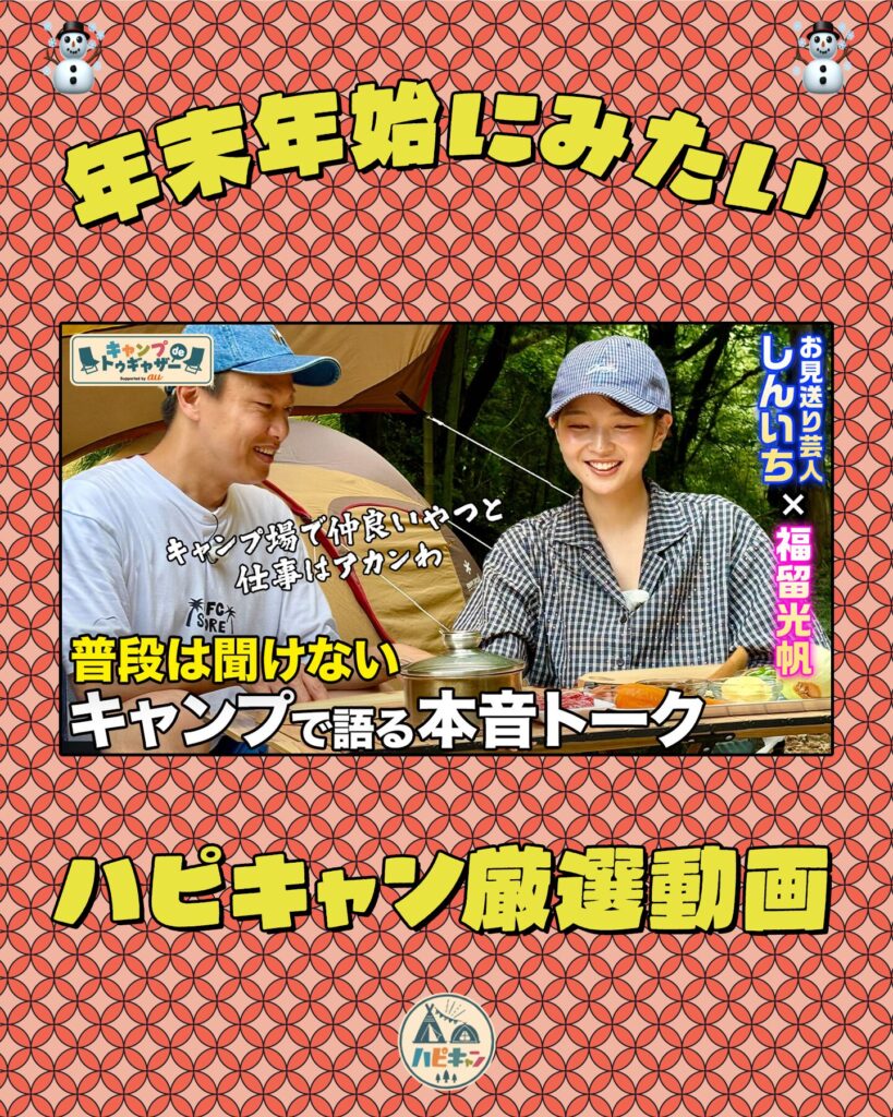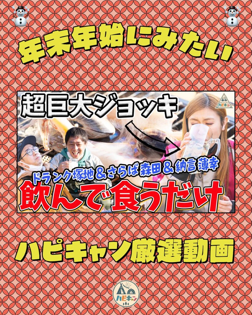 ハピキャンYouTubeチャンネルでは、今年人気だった冬キャンプ動画を中心に、「年末年始にゆる〜く観たいハピキャン」のプレイリストを公開中!