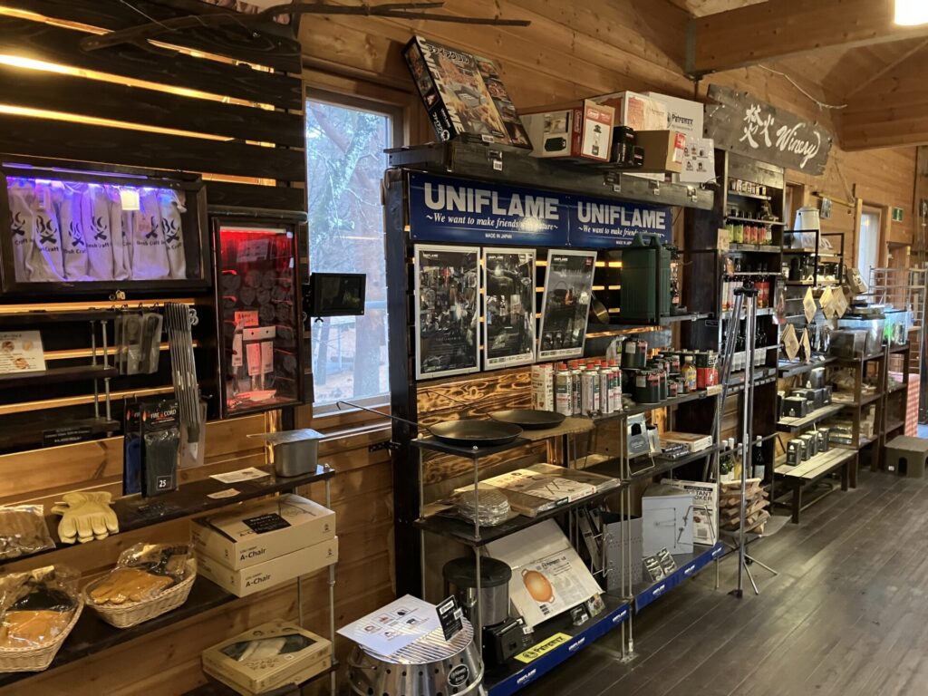 ゲストハウスには焚火Proショップ「Bonfire」が併設されていて、ColemanやUNIFLAME、Snow Peak、LODGEなどの商品が取り揃えてあります。