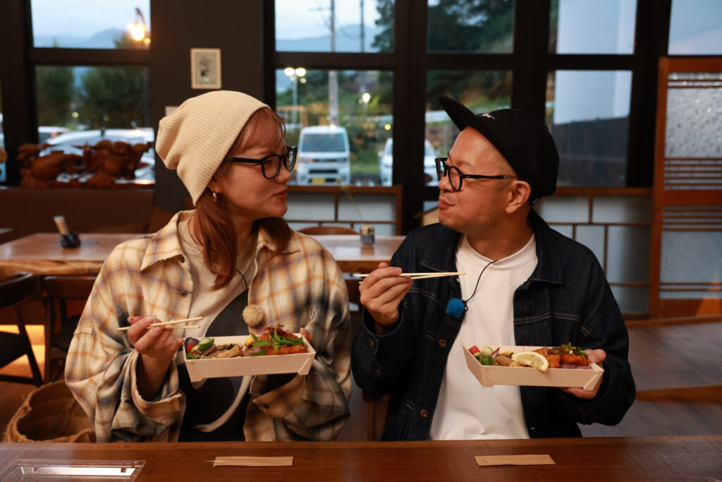 運ばれてきた特製弁当のボリュームと彩りに、「おぉ〜!豪華!」とトンボさんのテンションも最高潮に。「野菜が甘い! 身体に染みる〜」とりおさん。
