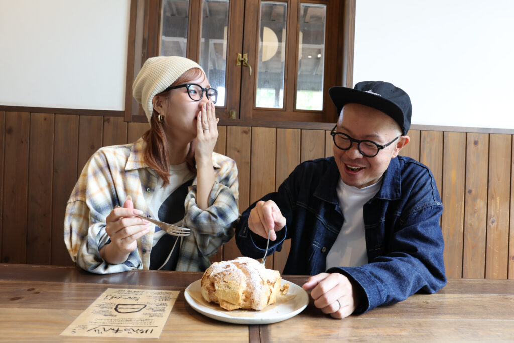 サクサクの生地から、注文後にたっぷり詰めるクリームが口に広がると、トンりお夫妻もこの笑顔。代表の駒田シェフとの楽しい会話にも、ふたりの笑顔が咲きました。