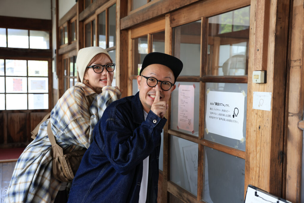 校舎に足を踏み入れた瞬間、「うわ〜、懐かしい!」と声を弾ませるりおさん。しかし、ここから先のエリアは「声出しNG」。入店早々、口をぎゅっと結んでソワソワし始めるトンボさんに、りおさんは思わずクスッと笑顔に。