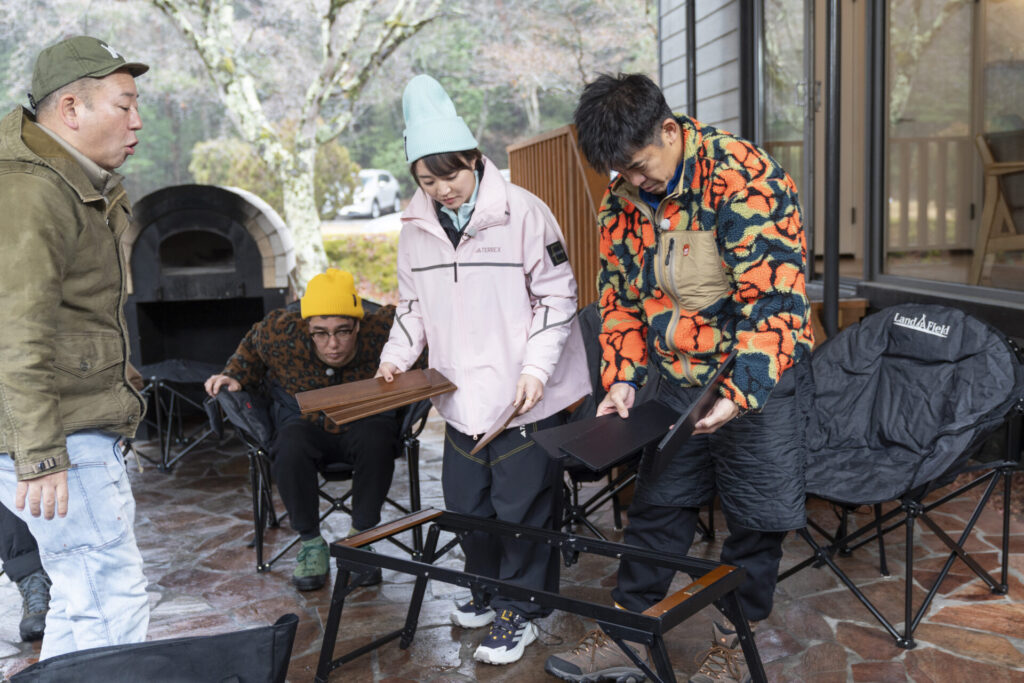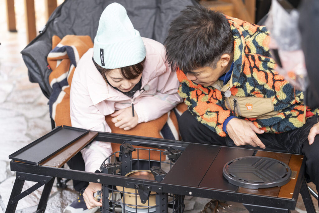 テーブルの中央にストーブがカチッ!とドッキングした瞬間、全員から「わーーーー!」と今日一番の歓声が上がりました。小木さんも待ちきれない様子で、まさにロマンが詰まった基地の完成です!