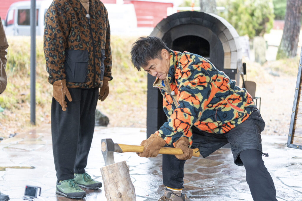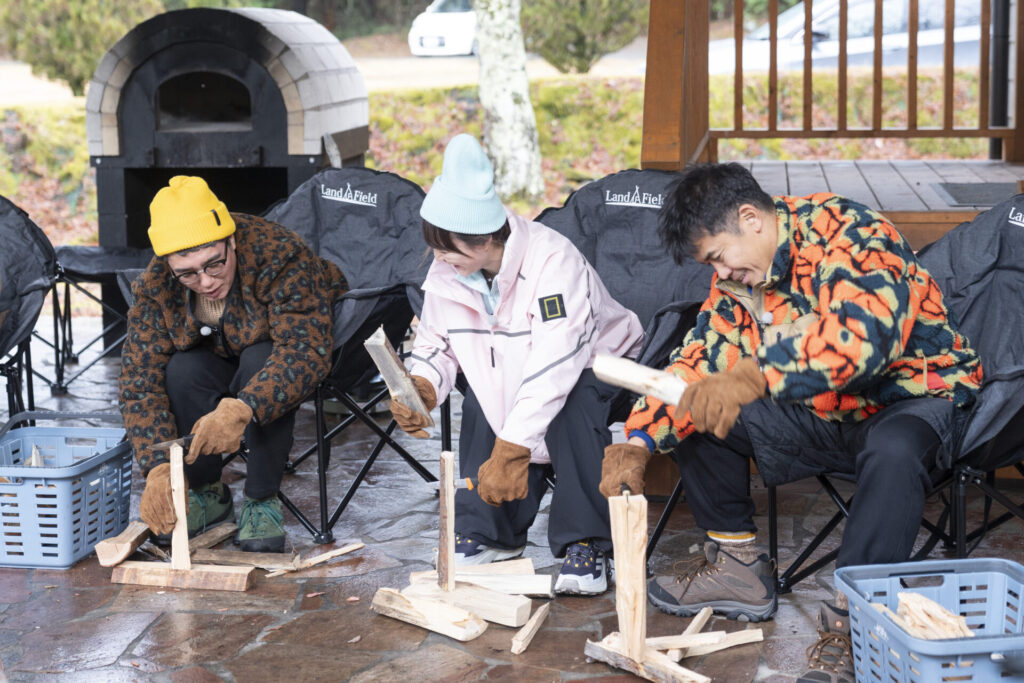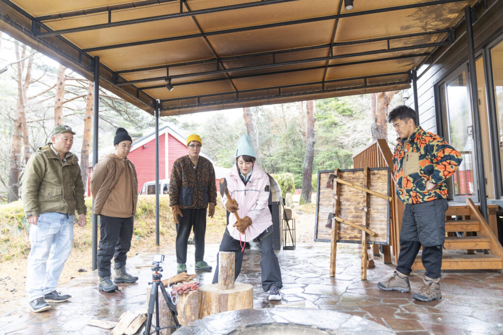 さらに細かく薪を割る「バトニング」では、角田さんが驚きのポテンシャルを発揮!あまりのスピードに、もはやトレーニングを見ているかのよう。