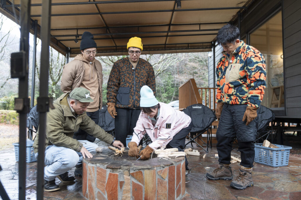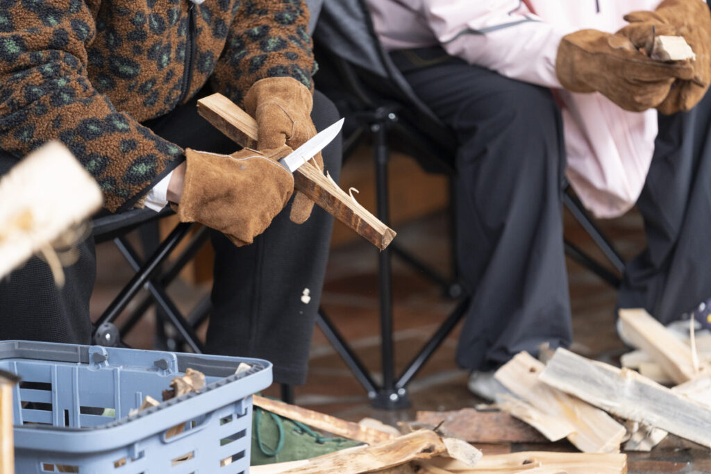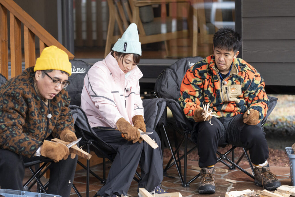 その後は、天然の着火剤「フェザースティック」作りへ。西村さんの職人技に感心しつつ、小木さんも負けじとオリジナルの削り方「小木スティック」を披露します。