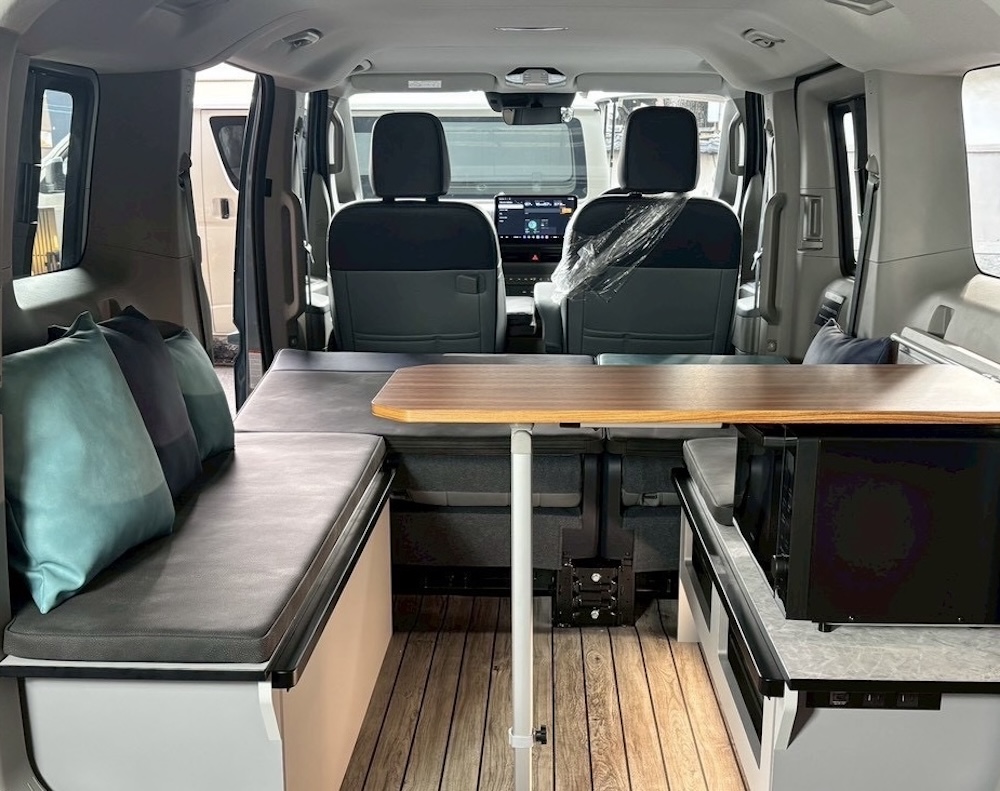 純正シートによる日常使いのしやすさを残しつつ、リアスペースには広々としたベッドと電子レンジをレイアウト。車内で景色を眺めながらゆったり過ごす、“滞在型キャンプ”にフィットする設計です。