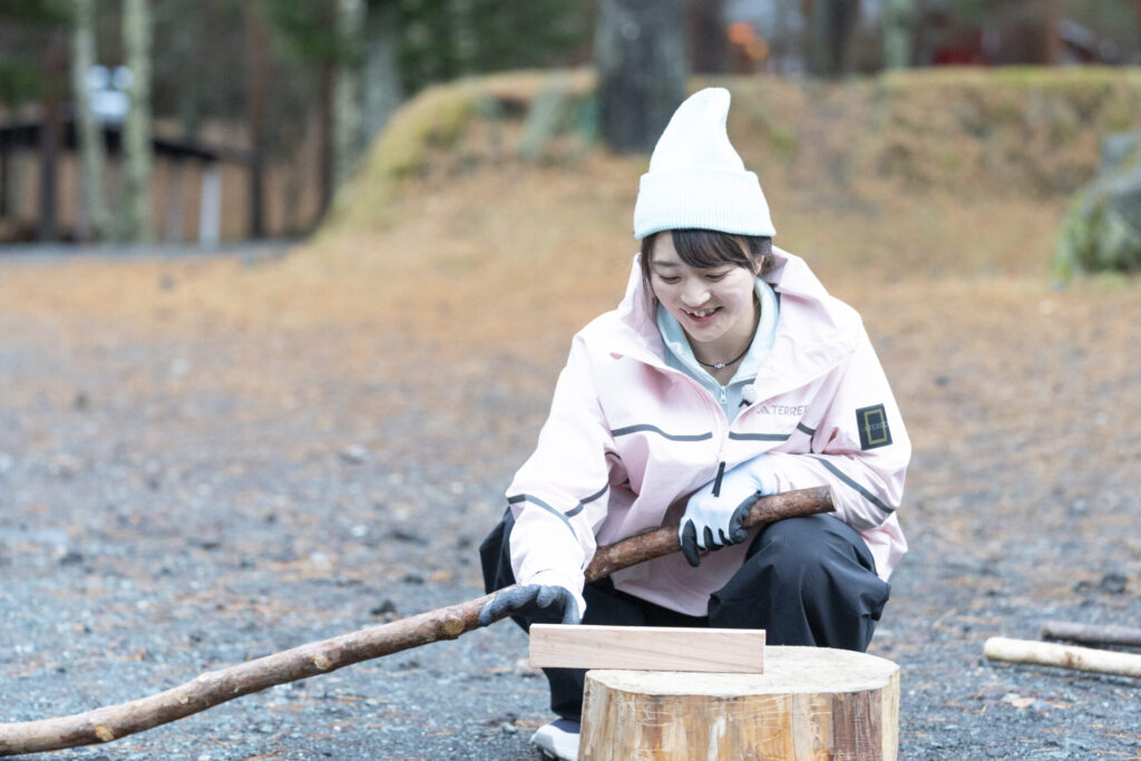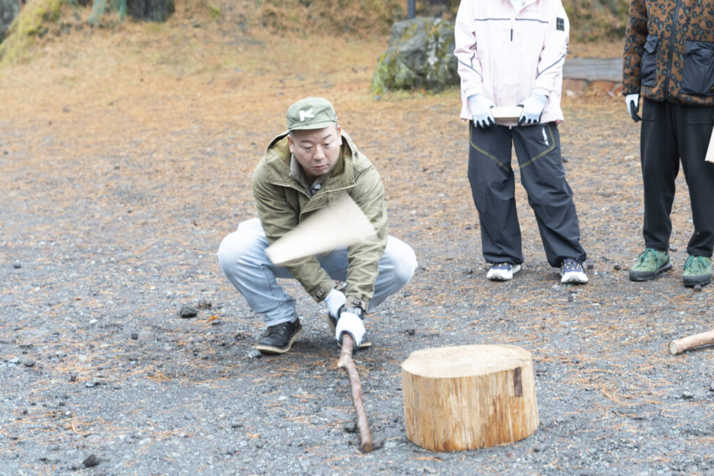 基地の設営と焚き火の準備が完了したところで、夕食のメイン食材をかけ、西村さんが提案したのは「棍棒飛ばし」。 置いた薪の端を別の棒で叩き、その飛距離を競うというシンプルな競技ですが、全員「想像がつかない」と困惑。