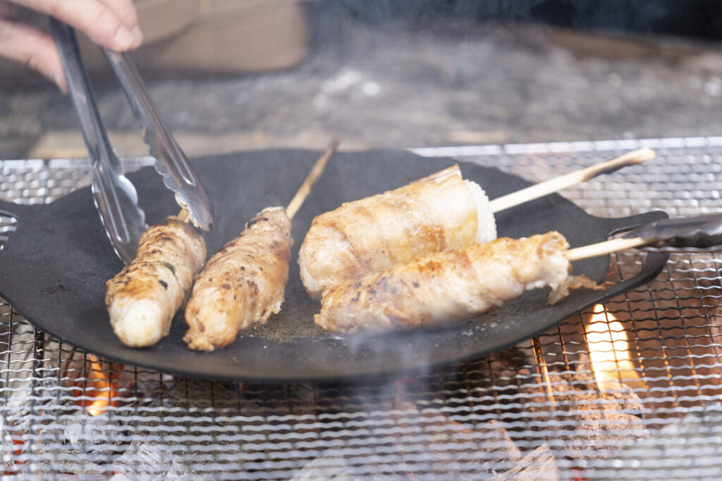 さっそく手に入れた食材を使い、メインディッシュの「肉巻き棒握り」作りに挑戦!キャンプにぴったりの、ワイルドかつ食欲をそそるメニューです。