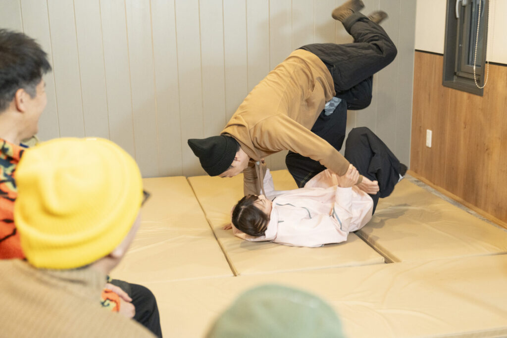 角田さんの代名詞ともいえる「巴投げ」を全員が体験することになりました。武井さんが率先してマットを敷き、準備は万端。たとえ技が来ると分かっていても逃げられない、本物の技に挑みます。