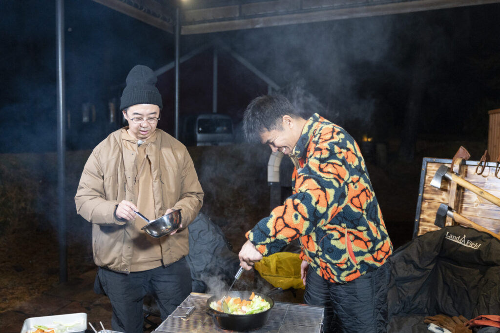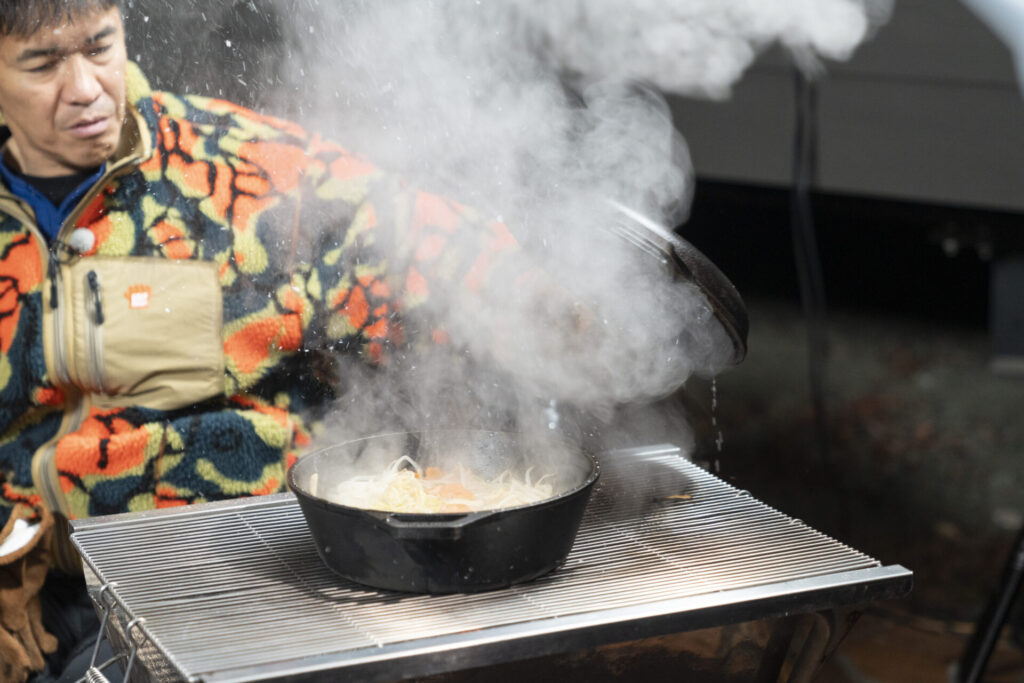 豚肉のパリパリ感と焦げた醤油の風味が絶妙にマッチ。手軽に作れるキャンプ飯に、全員から絶賛の声が相次ぎました。