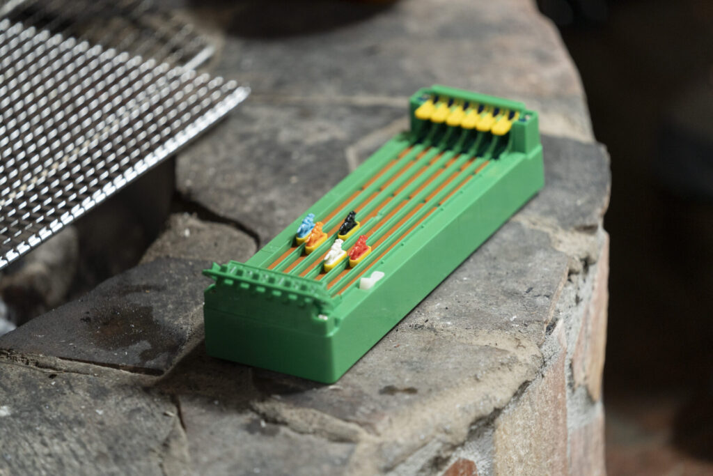 宴のあと、西村さんから最後のアクティビティとして「片付けをかけたゲーム」の提案が。 種目は、ハピキャン恒例の「競馬ゲーム」!