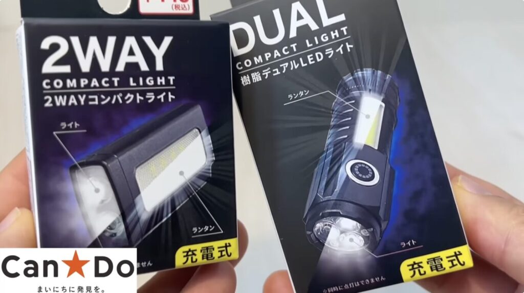 最後はキャンドゥでの購入品です。充電式のミニランタンライト、樹脂デュアルLEDライトと2WAYコンパクトライトのご紹介です。