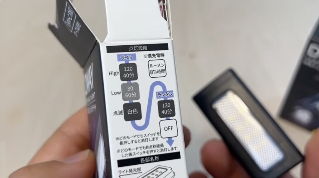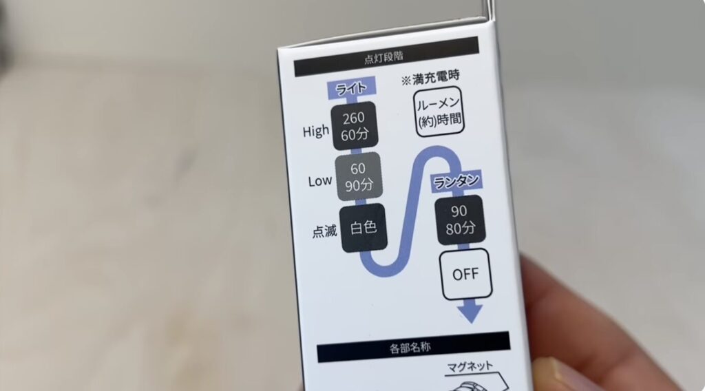 強は260ルーメンで60分、弱は60ルーメンで90分、ランタンモードは90ルーメンで80分となっています。