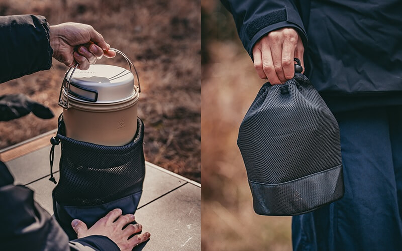 細部には、アウトドアギアとしてのこだわりが詰まっており、取っ手付きのアルミ製フタは、裏返せばそのままシェラカップのような取り皿として使用可能。本体は3点脚で設置するため、多少の凹凸がある場所でも安定して使用できます。