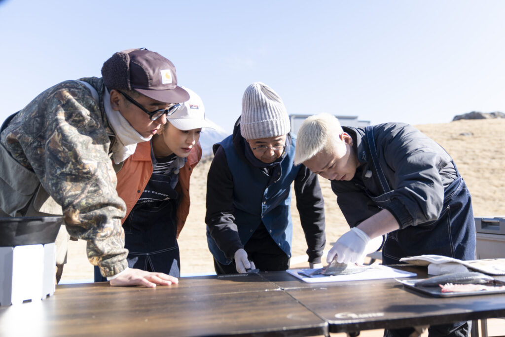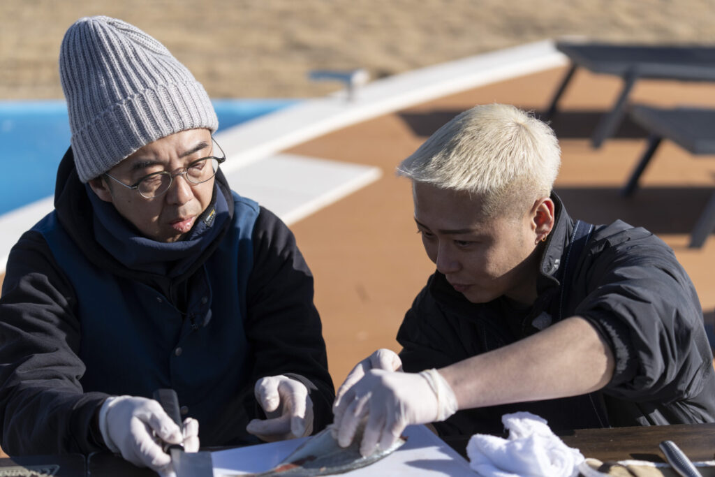 様子を見に来た小木さんと西山さんが魚の捌き方に興味津々。