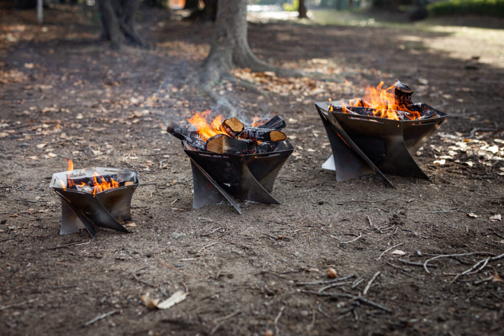 グループ向けの大型焚き火台でありながら、収納時は非常に薄くコンパクトにまとまるのが最大の魅力。