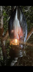 矢作さんのキメ顔!流木とオイルランタンがマッチしています。
