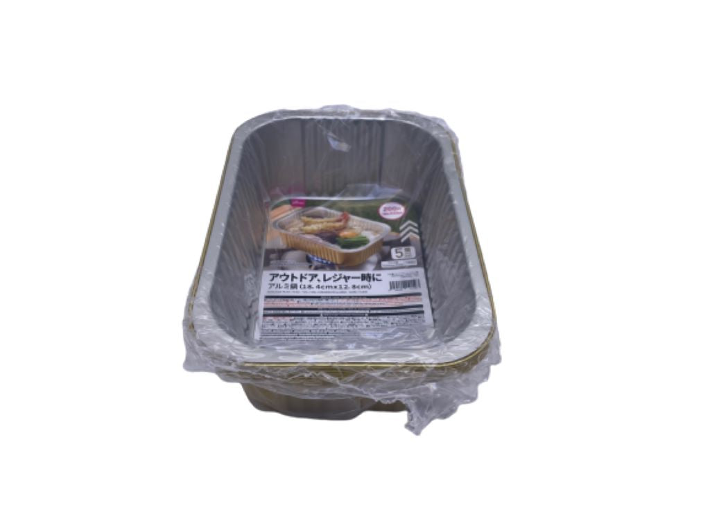 丸形と角形大の2種類は、内側は普通のアルミ鍋の銀色ですが、外側は金色です。持ってみると、鍋焼きうどんが入っているような容器より固めな気がするので、使い捨てながらに丈夫にできている印象でした。