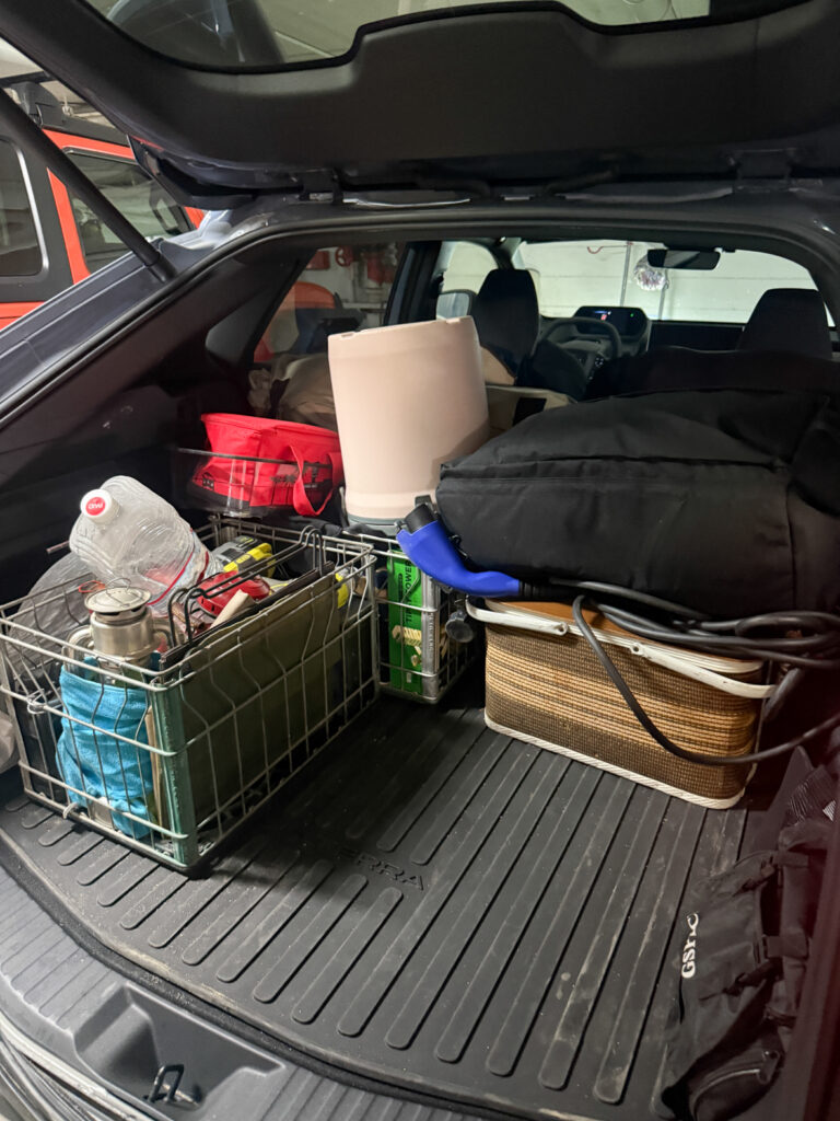 通常キャンプで使用しているJeepラングラーの2ドアは、後ろのシートを外して荷物を載せていますが、それでもソルテラのほうがたっぷり荷物が入り、荷物の出し入れも楽でした。