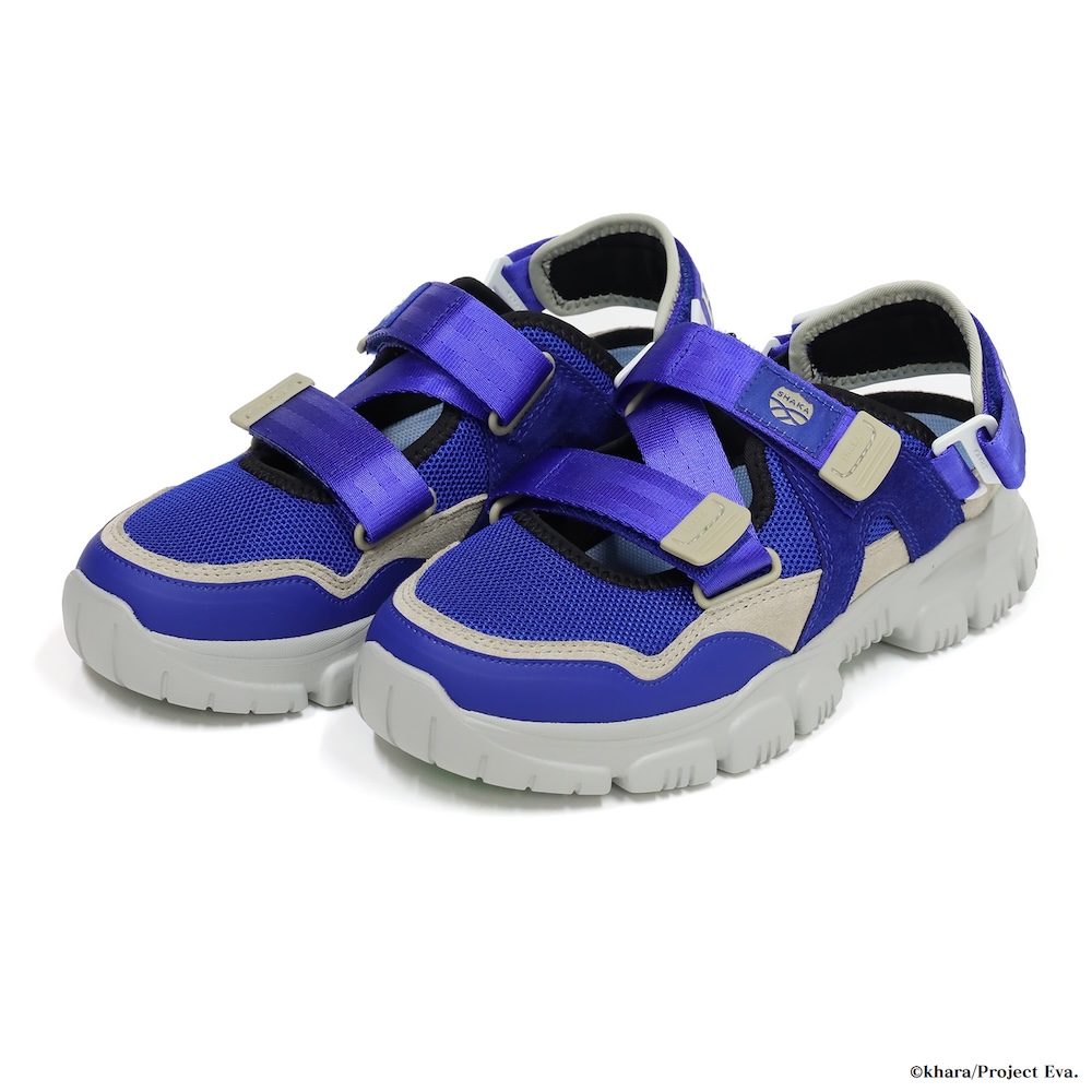 鮮やかなブルーを主軸に、グレイのスウェードを重ねた立体的な一足。綾波レイをイメージしたインソールの配色は、当時のファンなら思わずニヤリとしてしまう仕上がりです。