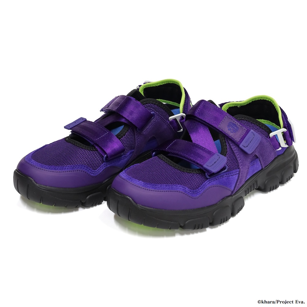 赤紫と青紫が織りなす、これぞ「エヴァ」というアイコニックな一足。ビビッドな黄緑色がソールに配され、足元に視線を釘付けにするストリート感溢れる表情を見せています。